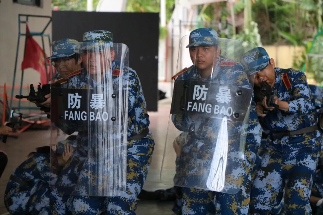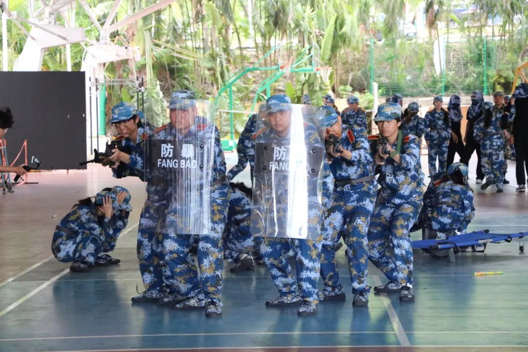 旅游与康体产业学院新生在反恐营救展示中模拟真实场景,分工协作、反应迅速,从战术配合到动作执行都精准到位,生动展现了军训期间的应急处置训练成果。