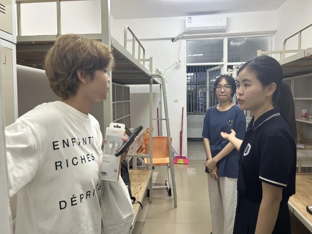 在走访过程中,老师的关怀藏在每一个细微举动里:询问新同学们刚来学校是否适应,室友们相处是否融洽;查看床铺护栏是否稳固、测试插座通电是否正常,逐一对宿舍设施完好度、安全达标情况细致排查;面对同学们初到校园的困惑,从“课表在哪看”到“校园卡怎么充值”,都耐心倾听、逐一解答;还反复强调“财产安全别大意,笔记本电脑、手机等贵重物品,离开宿舍一定要锁进柜子,出门务必锁好门窗;用电安全更要记牢,千万别用大功率违规电器,充电线不用时及时拔掉,避免安全隐患”;叮嘱大家早点休息,养好精神。用一句句叮嘱、一个个细节,为大家在这初来乍到的陌生环境带来温暖。