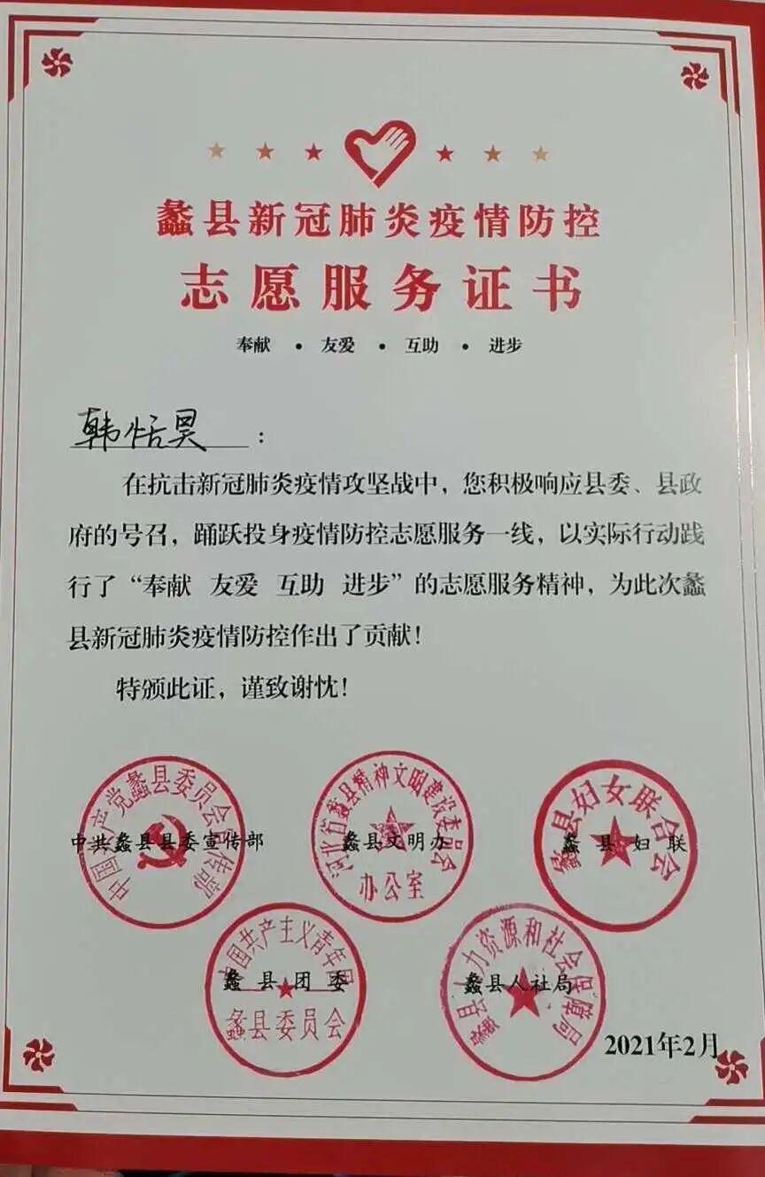 韩恬昊同学在这次新冠疫情中积极响应县政府号召,踊跃投身蠡县疫情防控志愿服务,在北刘佐村卡口值守、登记信息、维持秩序、开展防疫知识宣传。社区疫情防控志愿者的工作让我体会到了政府的强大决策力,工作人员的勤奋拼搏精神,培养了我与陌生人沟通的能力和耐心,更让我深深体会到基层人员防疫工作的不易。我为自己能够在社区防疫工作中贡献自己力量而感到自豪。