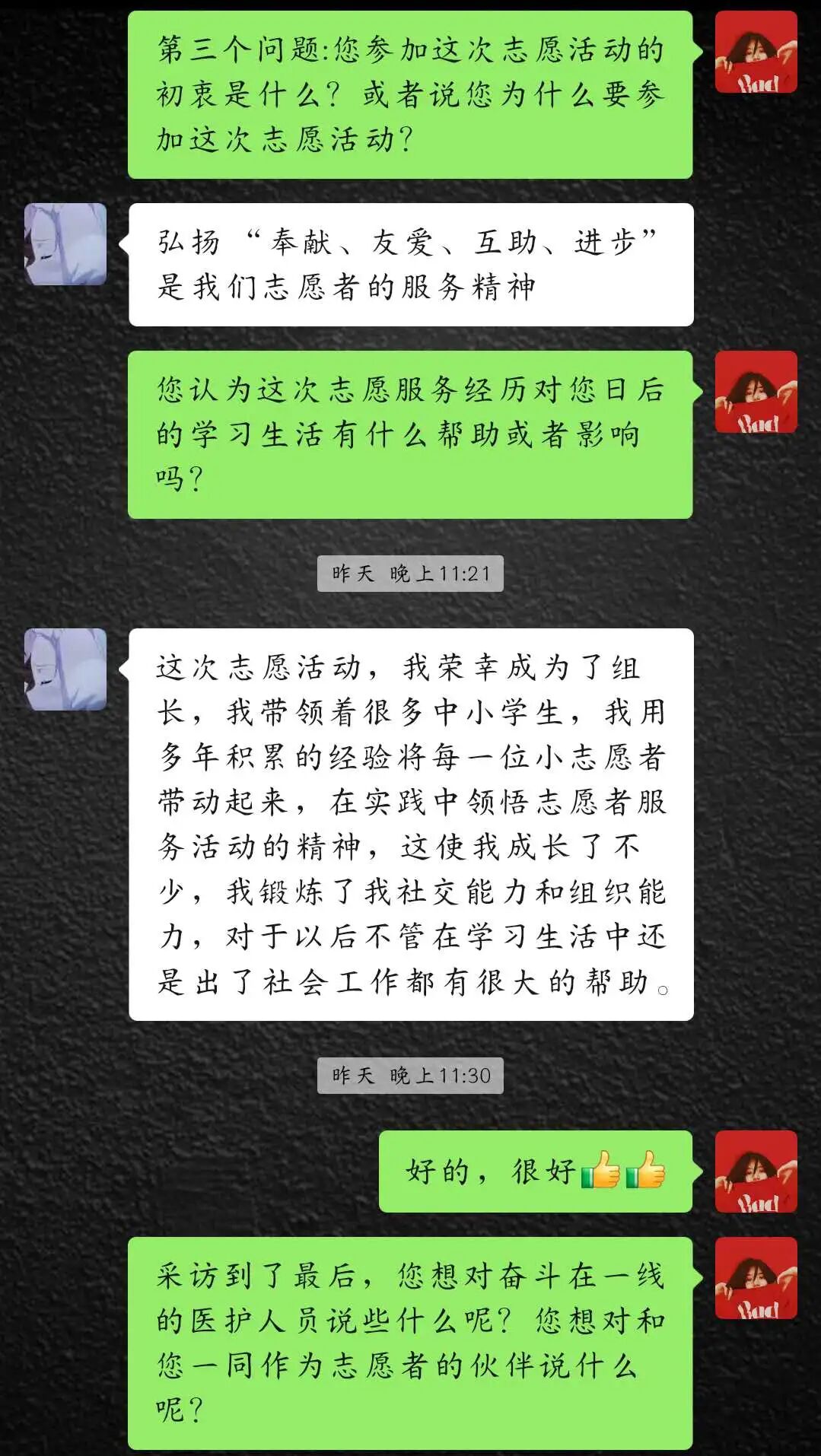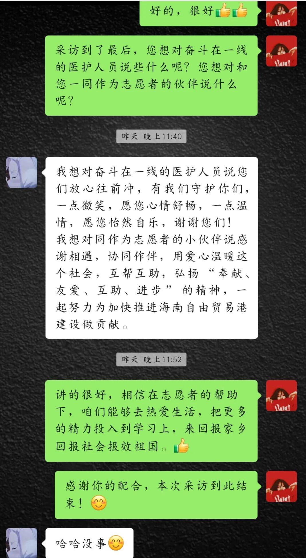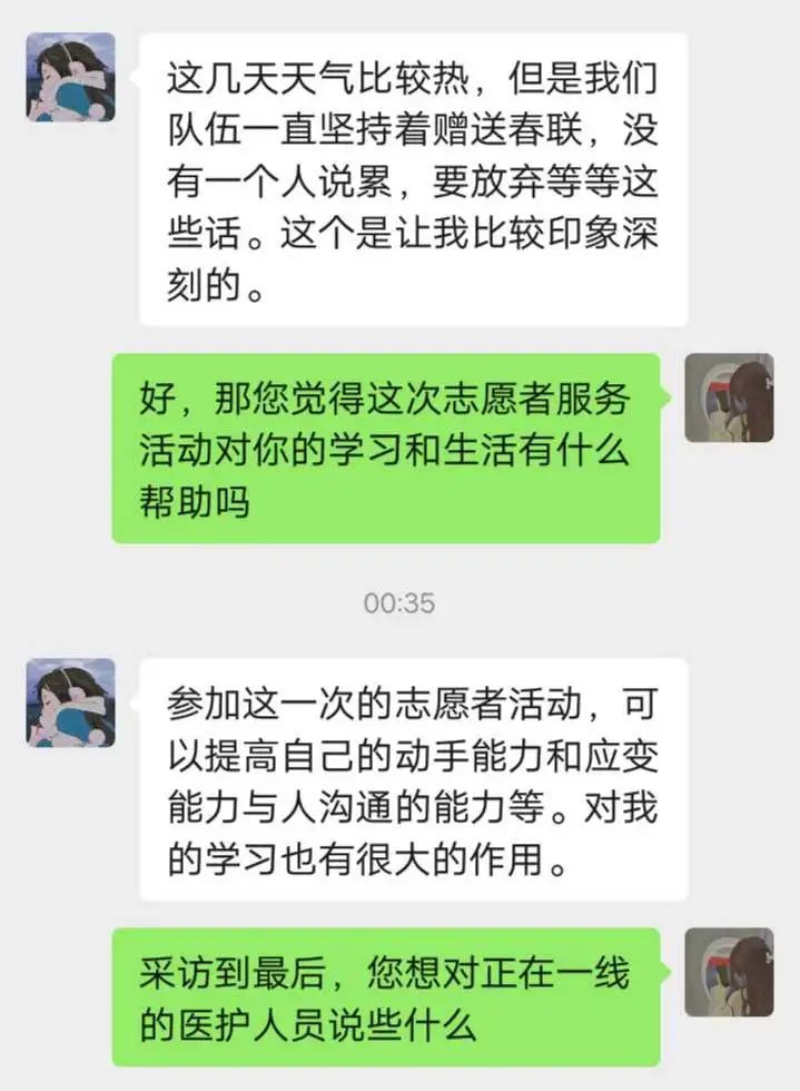 记者:采访到了最后,您想对奋斗在一线的医护人员说些什么呢?您想对和您一同作为志愿者的伙伴说什么呢?