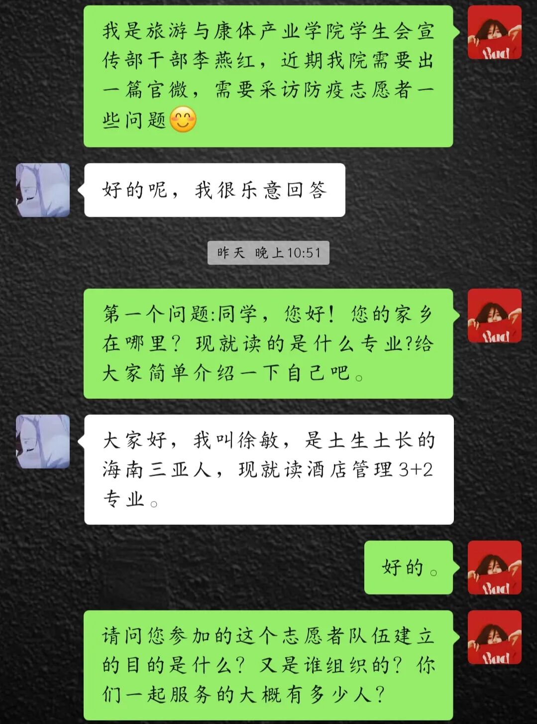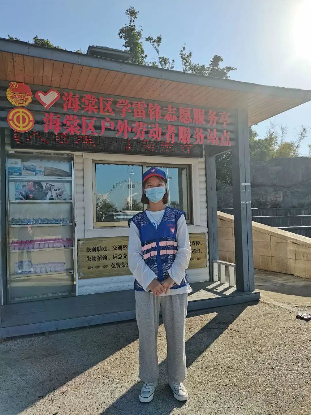 徐敏同学在校期间多次参与志愿者活动,此次寒假期间又在海棠区游客集散中心志愿者工作部参加了疫情防控培训工作,由医护人员给她们介绍目前疫情状况,如何自我防护以及如何服务他人。她主要负责在海棠湾广场服务,服务内容主要是交通咨询、旅游咨询、文明宣传、失物招领、免费寄存、卫生处理。平时在岗亭里帮助游客咨询,并且测量体温,提醒游客佩戴口罩,游客没有口罩的免费赠送,在路口协助交警和辅警。这一路上有苦有累,但是成长了很多,学习了应急知识,学习了青年人的责任,我明白一个人的价值体现在对这个社会做出的贡献,作为新时代青年人,要用服务他人,为社会做贡献的胸怀为祖国做贡献,志愿者行动,我一直在行动。