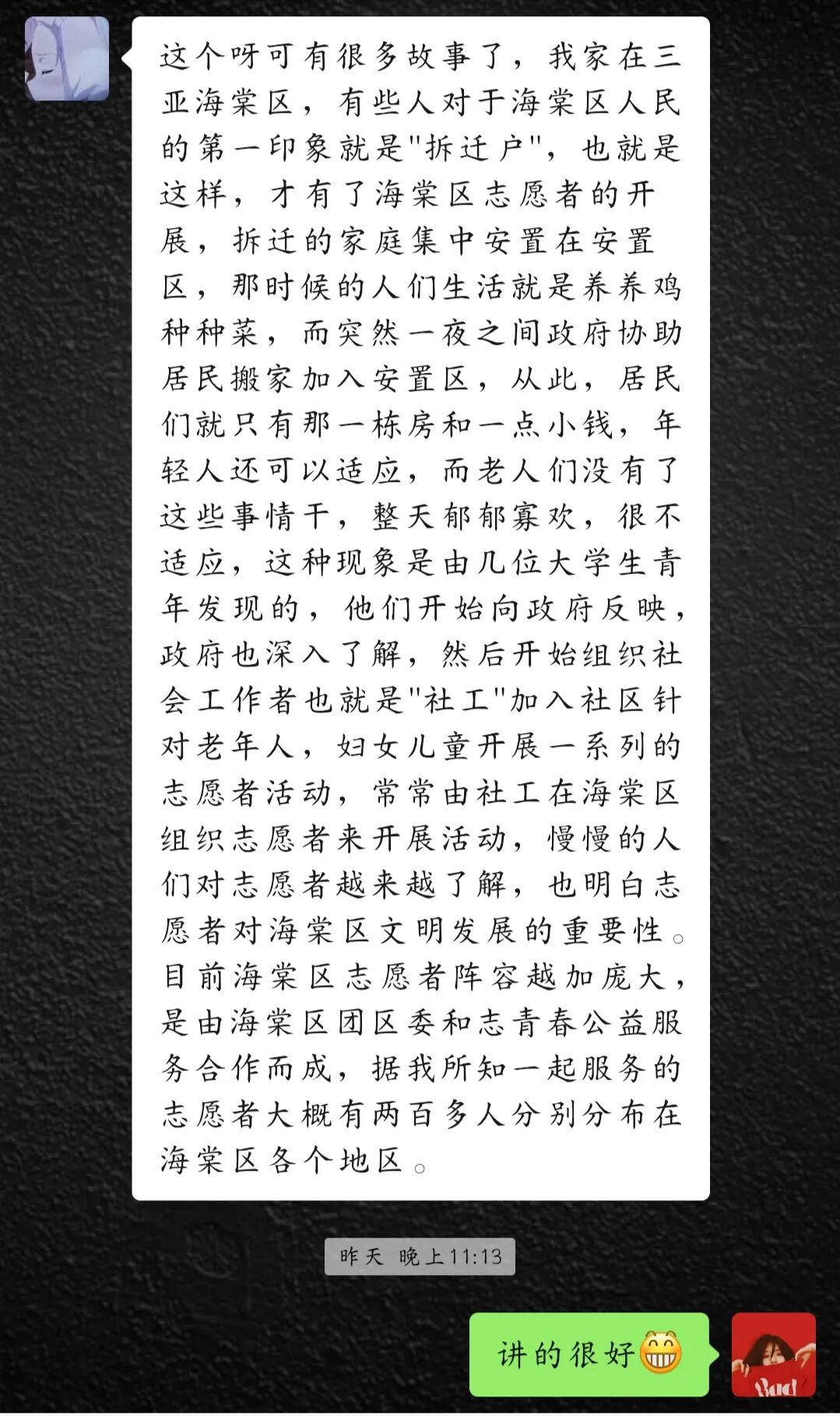 林慧芳同学,海南省儋州市排浦镇龙港村人。春节来临之际,为了慰问村里的贫困户,村委会组织写春联活动,将写好的春联送给贫困户。林慧芳在此活动中担任志愿者,全程参与春联的制作,从协助村民写春联、晾春联、到给贫困户送春联,这个过程充分感受到民风的质朴和温暖,更是提前感受到了浓浓的春节氛围。林慧芳同学表示,能以志愿服务的形式为村里贫困户送去节日慰问,我感到很荣幸。